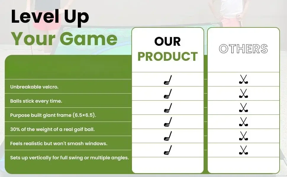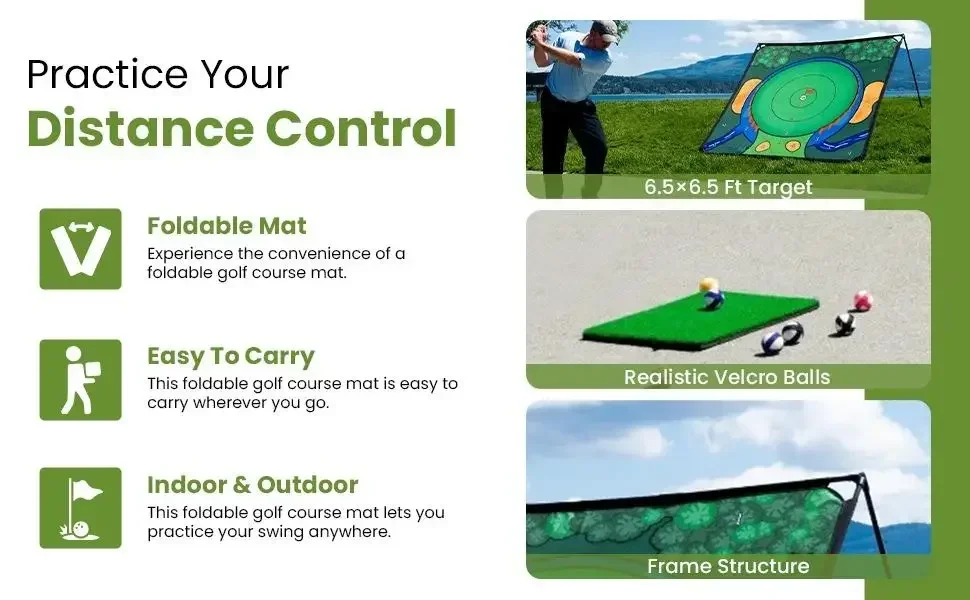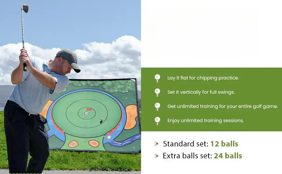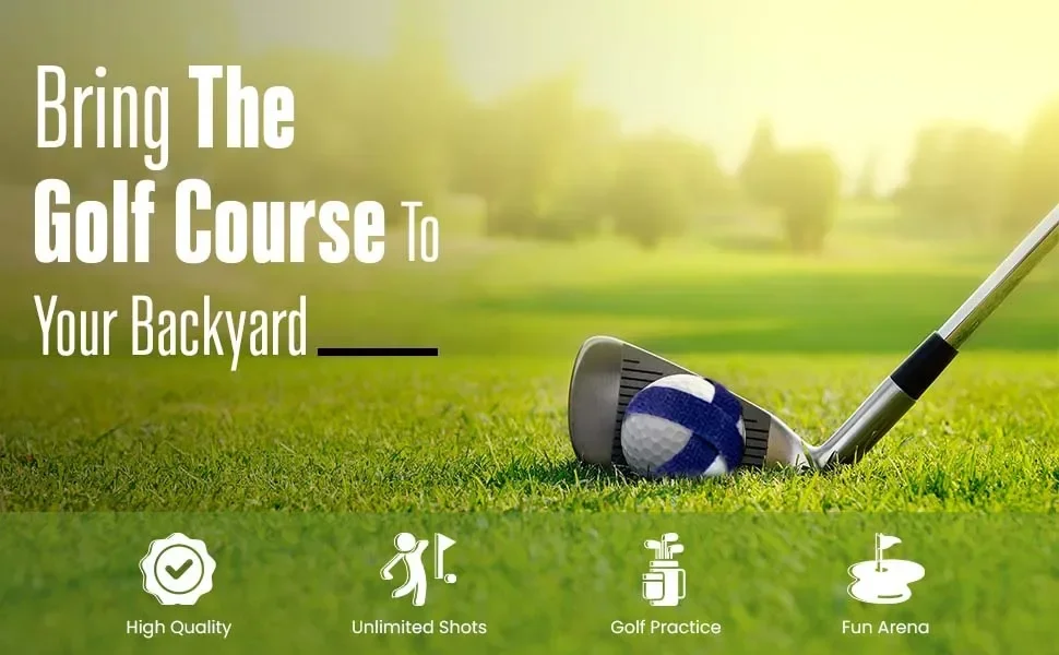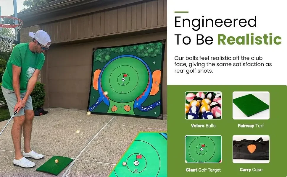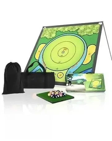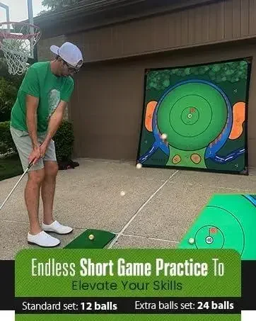 Experience golf like never before with Whether you’re a seasoned pro, a junior player sharpening your skills, or just a casual golfer, elevates your game with its versatile chipping setup. Made and distributed in the USA, it transforms your backyard into a mini fairway, allowing you to practice on your own time, in your own space. Each piece of the set is crafted for durability and performance, ensuring a premium golfing experience with every swing. Perfect for young golfers, it allows you to work on your technique without visiting the course.s specially designed balls give you the feel of a real shot without the risk of damage—these aren't your typical flimsy plastic balls. Ourare engineered to provide an authentic sensation while being just 1/3 of the weight of real golf balls, making practice more enjoyable and effective. Whether you're honing your short game or practicing full swings, is your go-to companion. Use it flat to sharpen your chipping skills or stand it upright for dynamic full-swing practice. It’s perfect for both indoor and outdoor use, giving you flexibility to play anywhere, anytime. With a 6.5 x 6.5 feet playing area, offers plenty of space to improve your short game or host friendly competitions. It’s more than just a game—it’s a new way to enjoy golf, your way, at home. Looking for a great gift for the golfer in your life? Whether it's for birthdays, holidays, camping trips, or Father's Day, is sure to be a hit. Ideal for dads, husbands, brothers, and golf enthusiasts of all ages, this set brings joy and skill enhancement to everyone. The set includes everything you need: a robust 6.5ft x 6.5ft fairway mat, realistic , and five integrated game modes. Bring the thrill of the course to your backyard and enjoy hours of golfing fun.