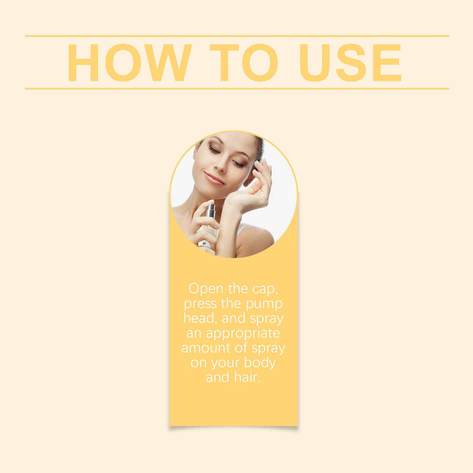 Open the cap, press the pump head, and spray an appropriate amount of spray on your body and hair.