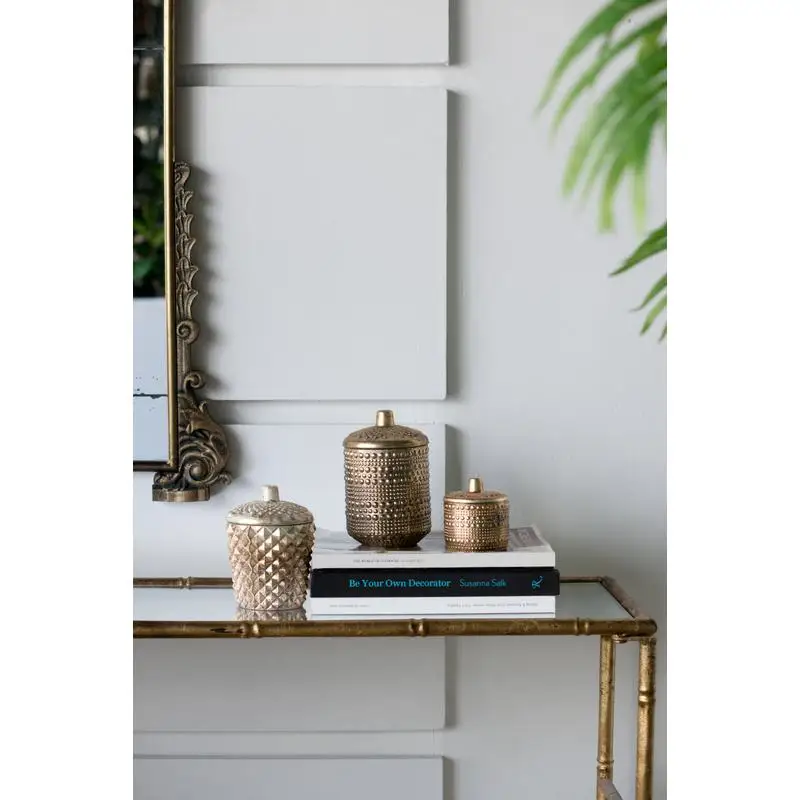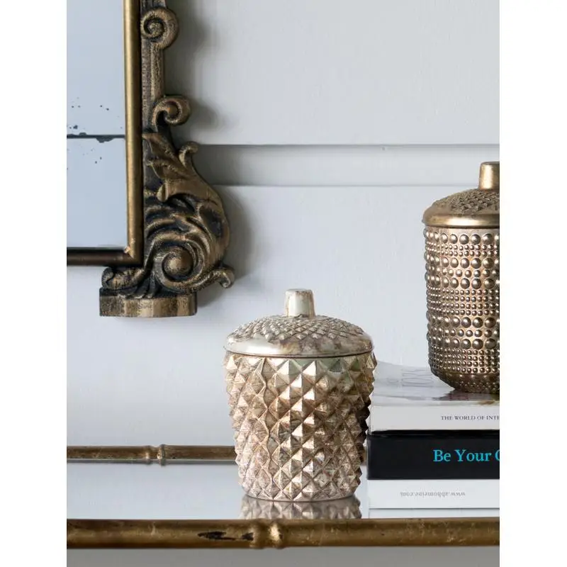 This tapered and diamond textured soy wax candle catches the eye with its warmly shimmering enameled antique mercury finish. The metallic finish really sets off the many facets around the candle. The matching lid finishes off the luxe look and keeps the candle inside clean and dust-free.