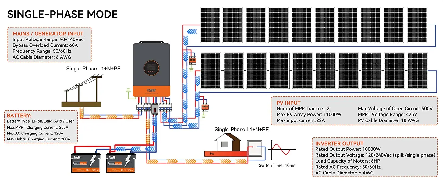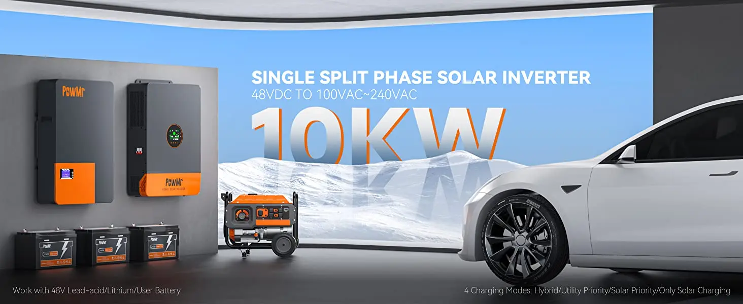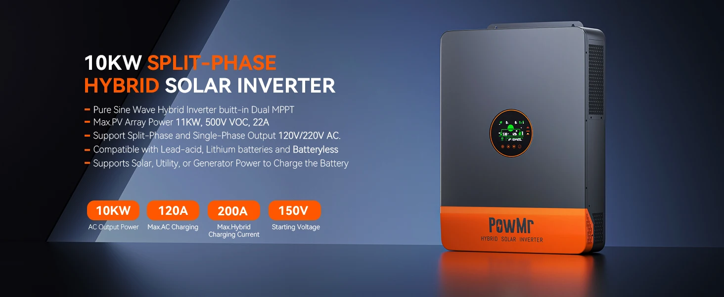 PowMr Split-Phase 48V 10KW Hybrid Inverter 120/240V AC With 200A MPPT Solar Controller Max PV 500V Fit Lithium Battery Home Use