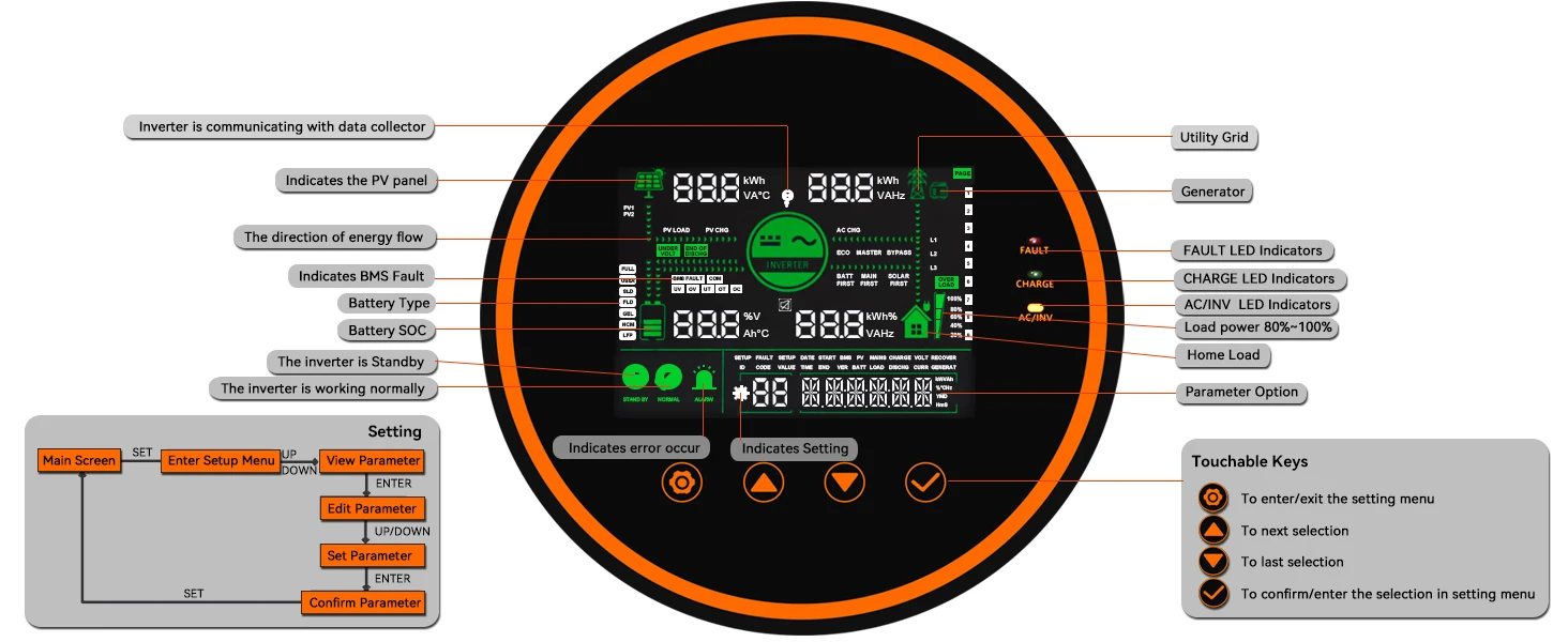 3.【COMPATIBLE WITH VARIOUS BATTERIES】10000W 48V split phase power inverter is compatible with AGM, Gel, Lead acid, Lithium-ion, and LiFePO4 batteries, and support batteryless. Supports solar, utility, or generator power to charge the battery. It can flexibly schedule the Inverter charging and discharging time. With a dual activation function when the li-ion battery is dormant; either mains / photovoltaic power supply access can trigger the activation of the Li-ion battery.