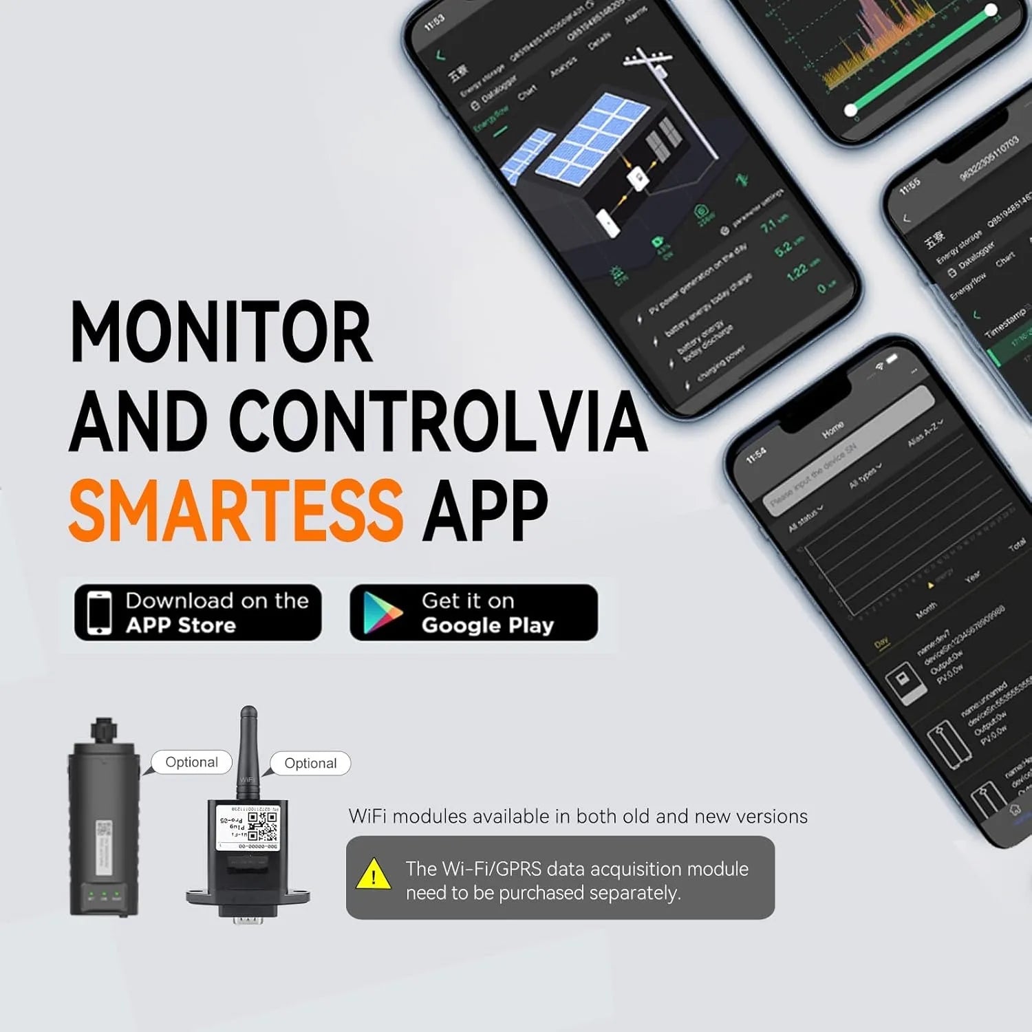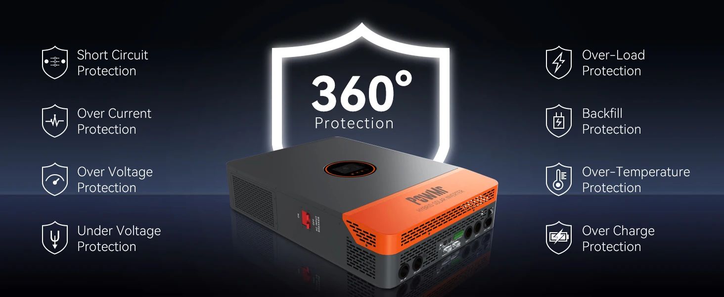2.【DUAL MPPT】Dual MPPT with 99.9% efficiency and maximum 22A current in a single circuit, perfectly adapted to high-power modules. Supports two solar inputs and simultaneous tracking of two solar maximum power charging/carrying capacity functions. Support split-phase and single-phase pure sine wave output.