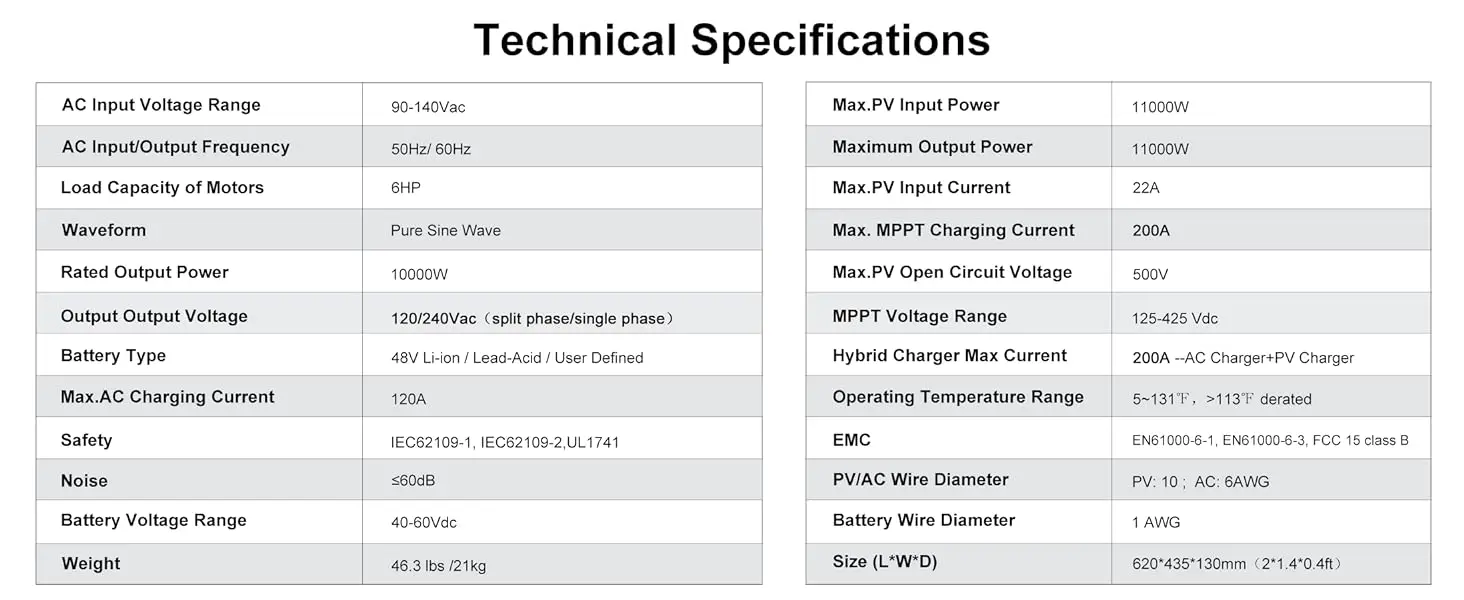 4.【TECHNICAL SPECIFICATIONS】Hybrid Solar Inverter 48V built-in 200A MPPT controller and 10KW Pure sine wave inverter. Rated Output Power: 10000W continues (Surge 20000W), Rated Output Voltage: 120/240Vac (split phase/single phase), Switch Time: 10ms, Max.PV Input Power: 11KW(5500*2), Max.PV input Voltage: 500Vdc, Max.PV input current: 22A, Starting voltage more than 150V, PV Wire:10AWG. Support CAN, USB, and RS485 communication.